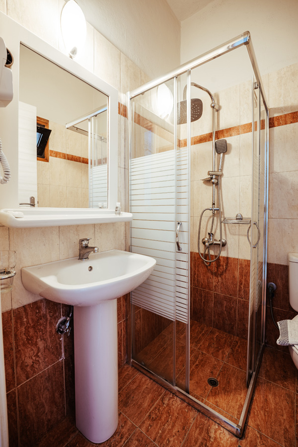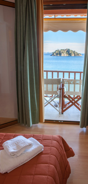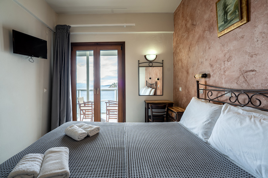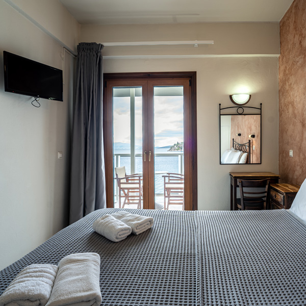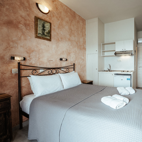 Our double studios accommodate two persons, have a balcony with a view of the whole of Tolo bay, private bathroom and kitchenette facilities giving you a little more independence. Perfect for couples.