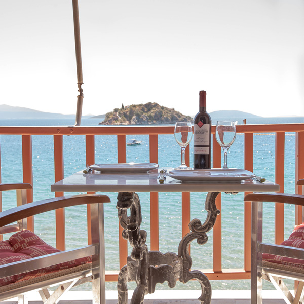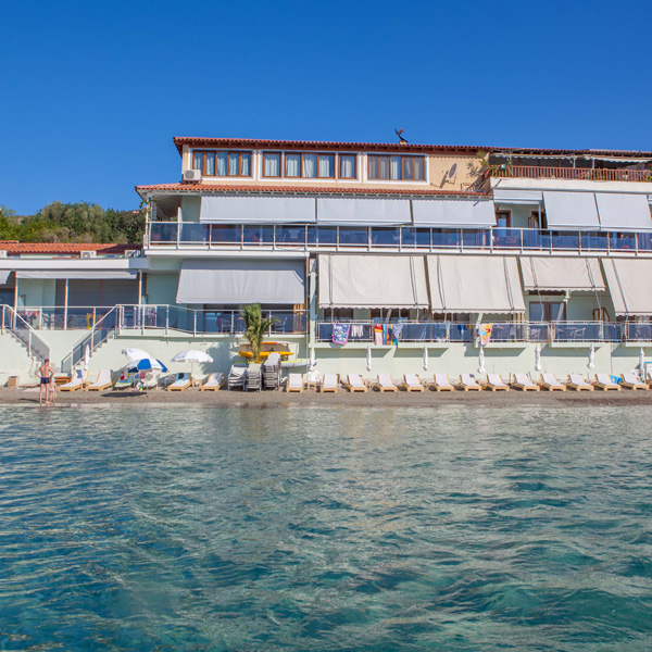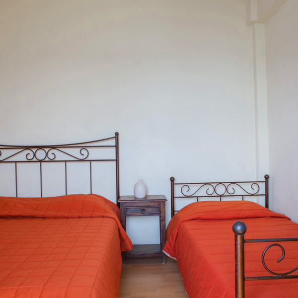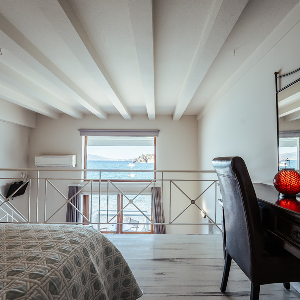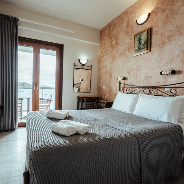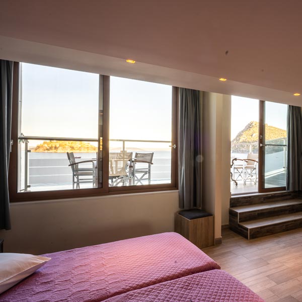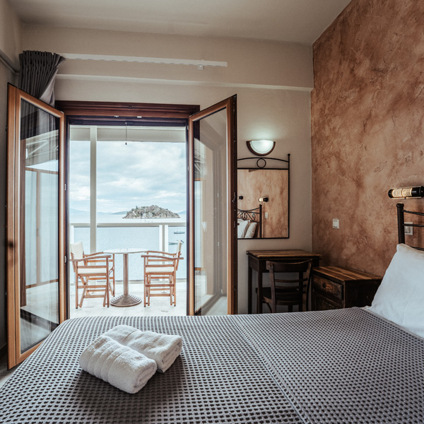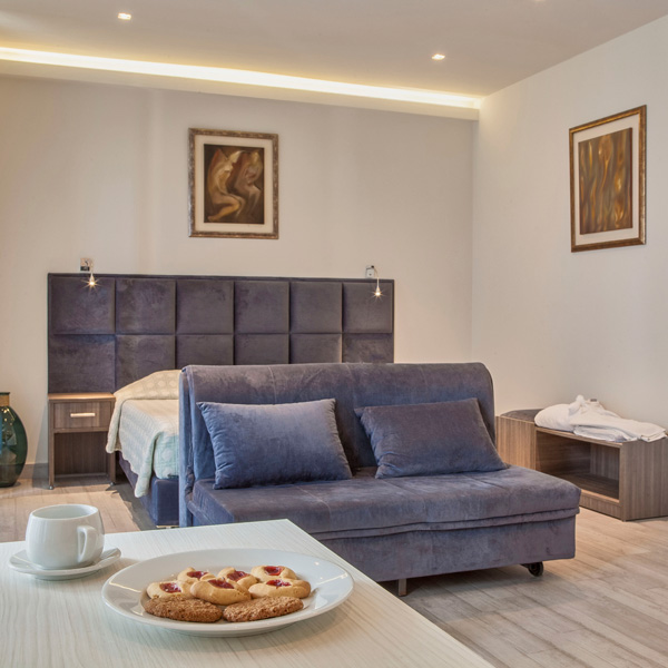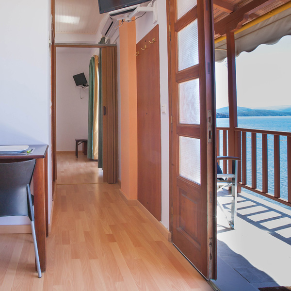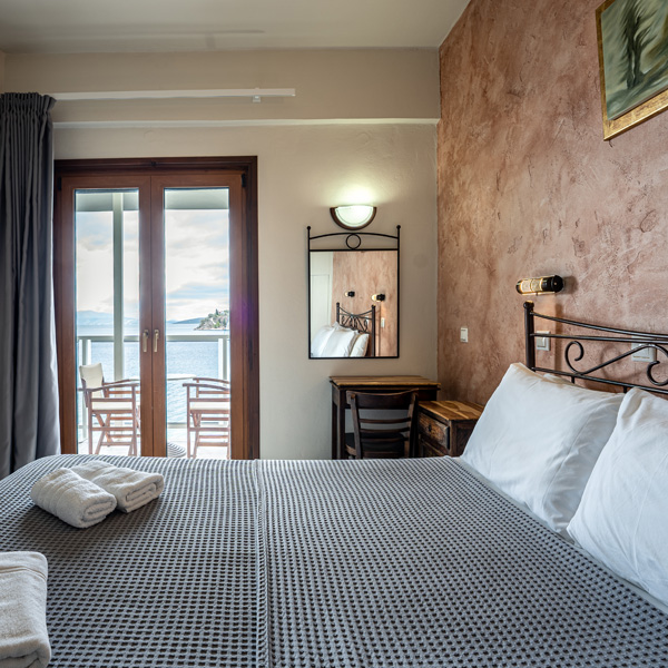 Our triple studio is the perfect choice for small families, ideal for two adults and 1 child (up to the age of ten) and has one double bed and one sofa bed. The kitchenette facilities make our guests a little more independent. The balcony, like all of our rooms, overlooks the beach and has spectacular sea views.
